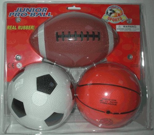 Set of 3 Real rubber Soccer ball basketball are 4 12 in diameter Football is 7 x 4 in diameter Ages 3 Read More..